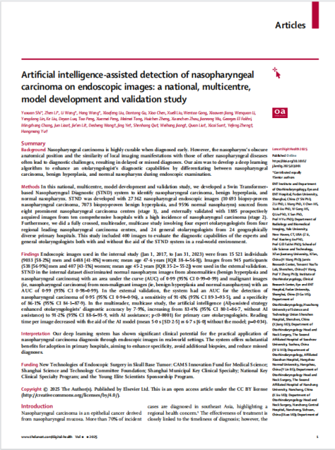 《柳叶刀-数字医疗》:余洪猛团队牵头推出鼻咽癌内镜图像辅助筛查系统
